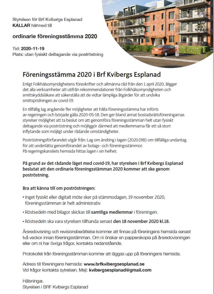 På grund av det rådande läget med covid-19, har styrelsen i Brf Kvibergs Esplanad beslutat att den ordinarie föreningsstämman 2020 kommer att ske genom poströstning.